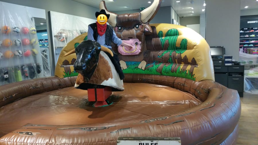 You'll need more than sheer brute strength if you want to stay on board our wild bull. If you've got a good sense of balance and you can detect which movement the bull is about to do then there's just a chance you'll come out the winner. But more often than not you'll find the bull has dumped you safely on our inflatable floor surround.